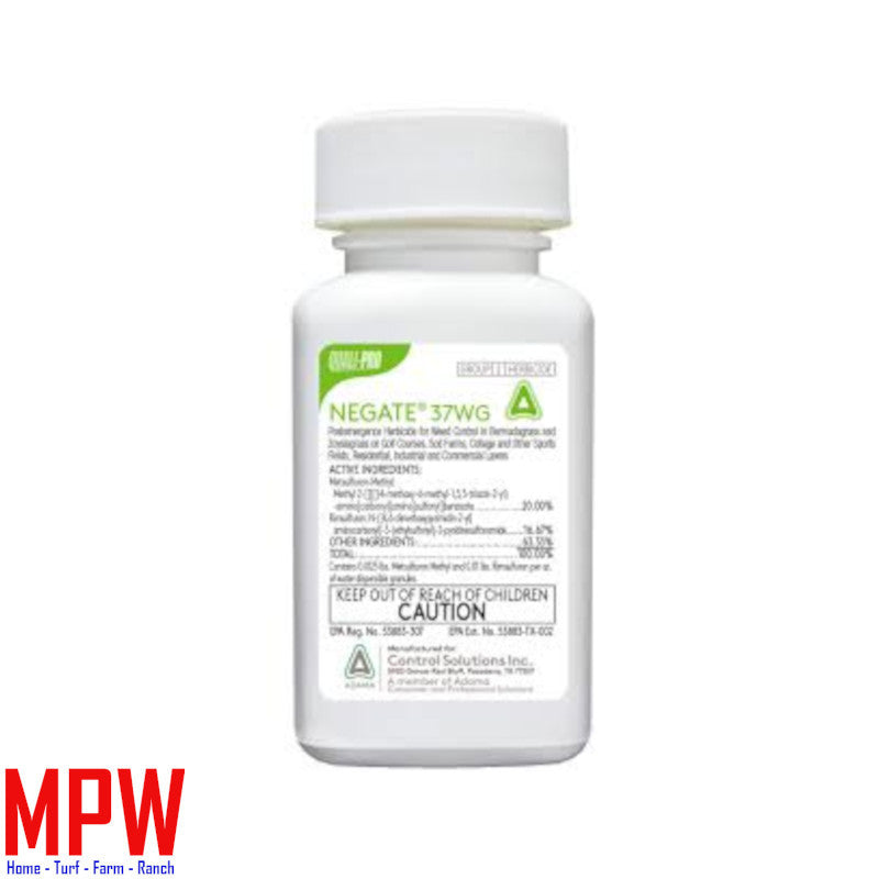 Dormant and non-dormant turf: Apply 1.5 ounces of Quali-Pro® NEGATE 37WG (0.019 lbs. Metsulfuron-methyl and 0.015 lbs. Rimsulfuron) per acre for weed control. Some chlorosis of the turf may occur following application.